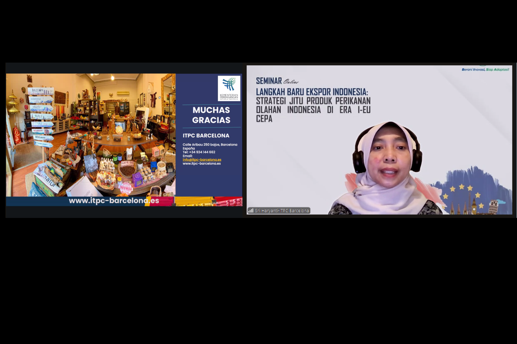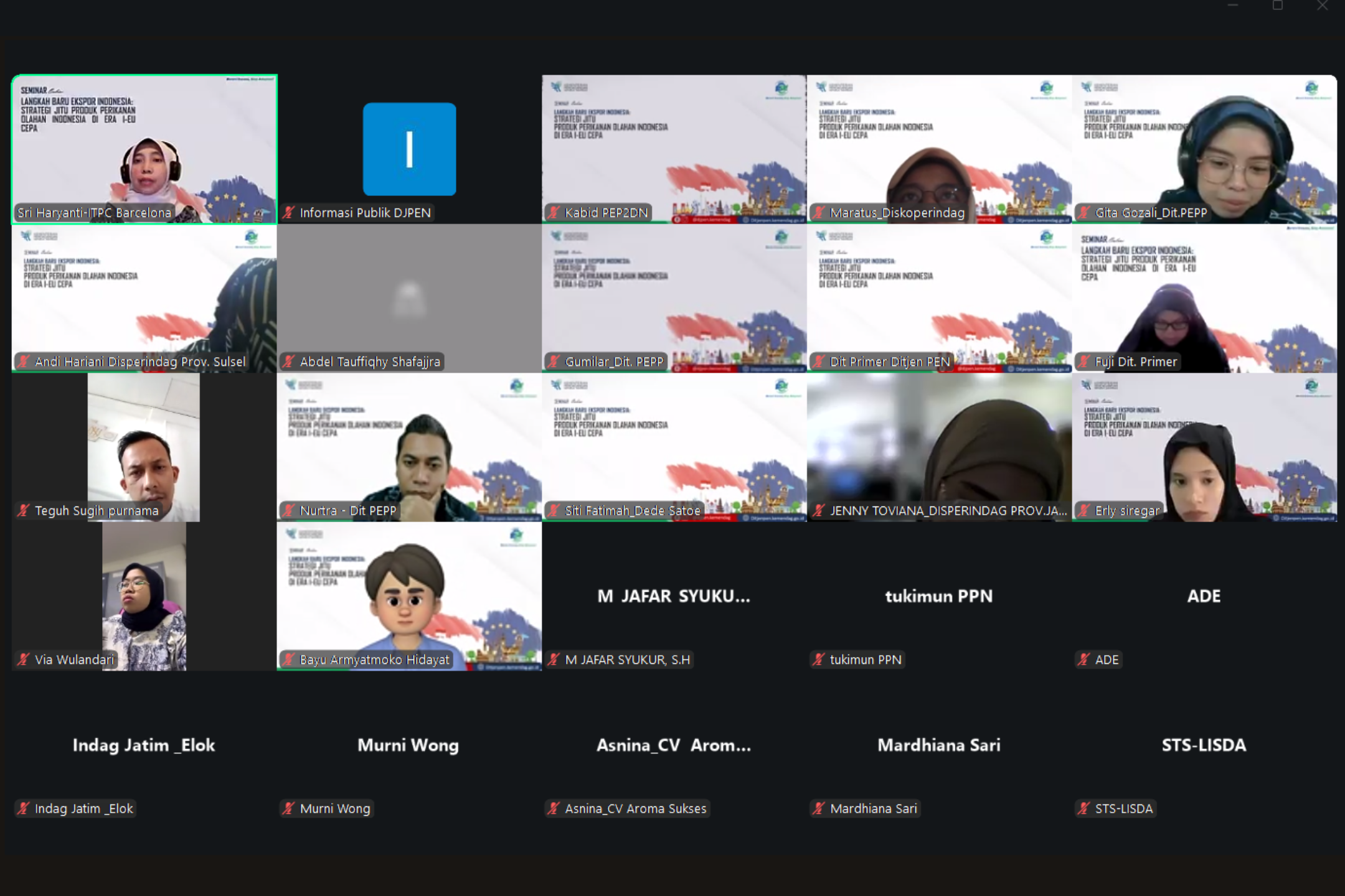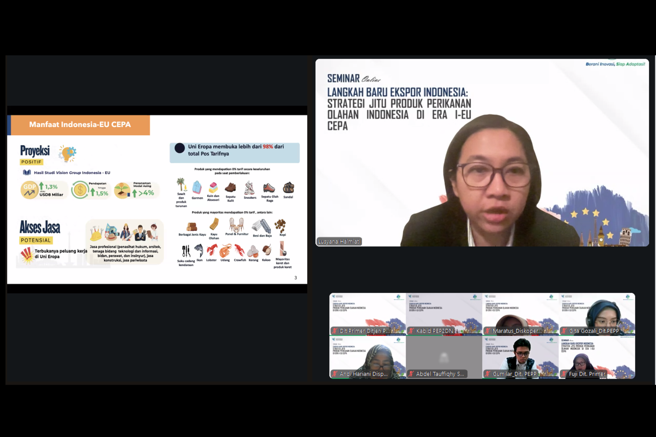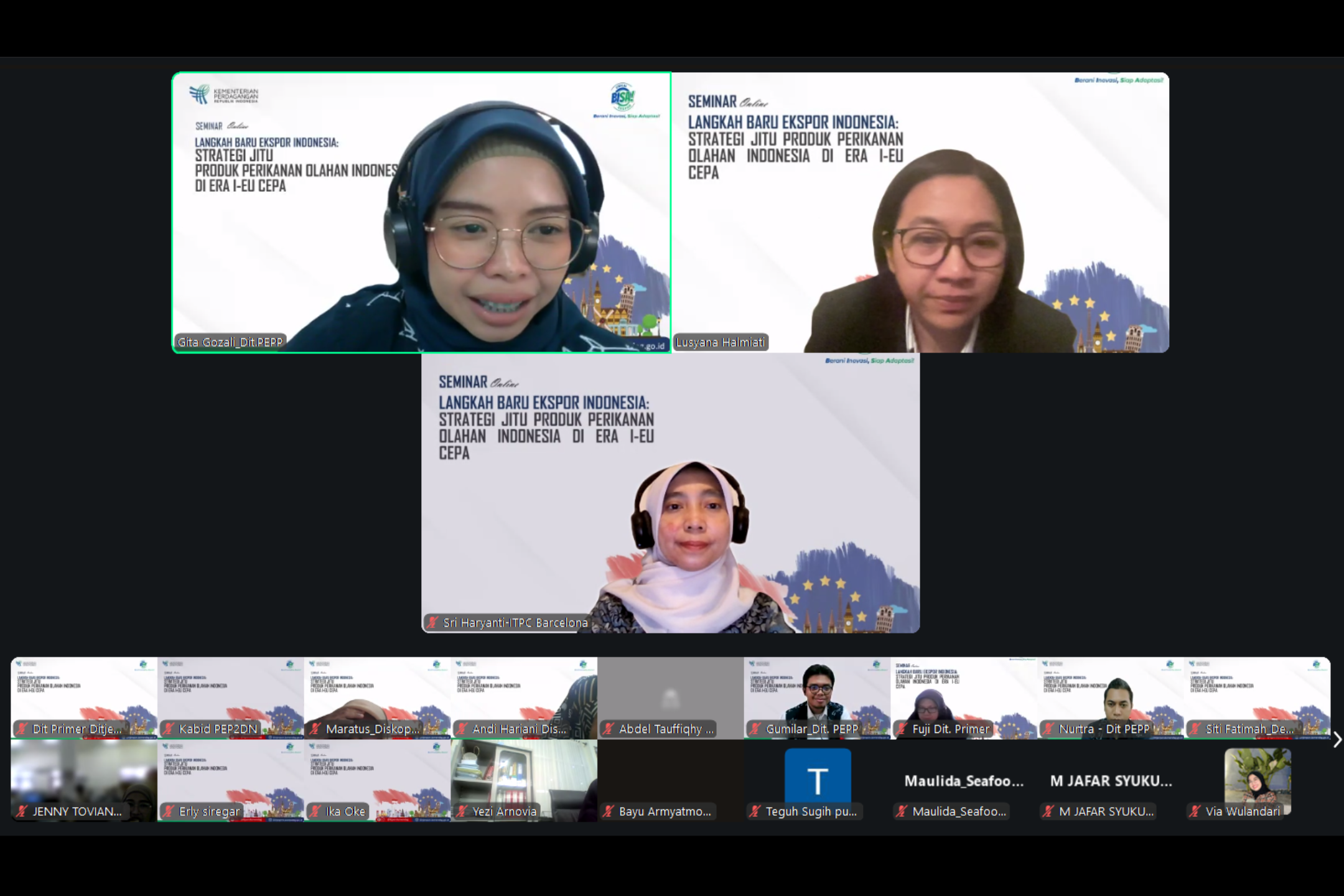 Direktur Pengembangan Ekspor Produk Primer, Miftah Farid membuka webinar Langkah Baru Ekspor Indonesia: Strategi Jitu Produk Perikanan Olahan Indonesia di Era I-EU CEPA pada (19 Nov). Kegiatan ini sekaligus sebagai sosialisasi pemanfaatan penjanjian kemitraan ekonomi komprehensif Indonesia-EU CEPA yang telah ditandatangani pada 23 September lalu. Dalam sambutannya Dirjen Miftah menyampaikan dengan memanfaatkan perjanjian IEU-CEPA, strategi yang tepat, serta kolaborasi dengan berbagai pihak diharapkan sektor perikanan olahan Indonesia dapat memperluas pangsa pasar di Uni Eropa. Sebagai narasumber dalam webinar adalah Atase Perdagangan Brussels, Lusyana Halmiati; Atase Perdagangan Hanoi, Addy P. Soemantry; dan Kepala ITPC Barcelona, Sri Haryanti. Webinar ini dihadiri oleh sekitar 150 peserta. Berdasarkan data, pada periode Januari-September 2025 nilai ekspor produk perikanan olahan Indonesia ke Uni Eropa tercatat sebesar USD75,54 juta atau meningkat signifikan sebesar 73,61 persen jika dibandingkan dengan periode yang sama tahun sebelumnya.