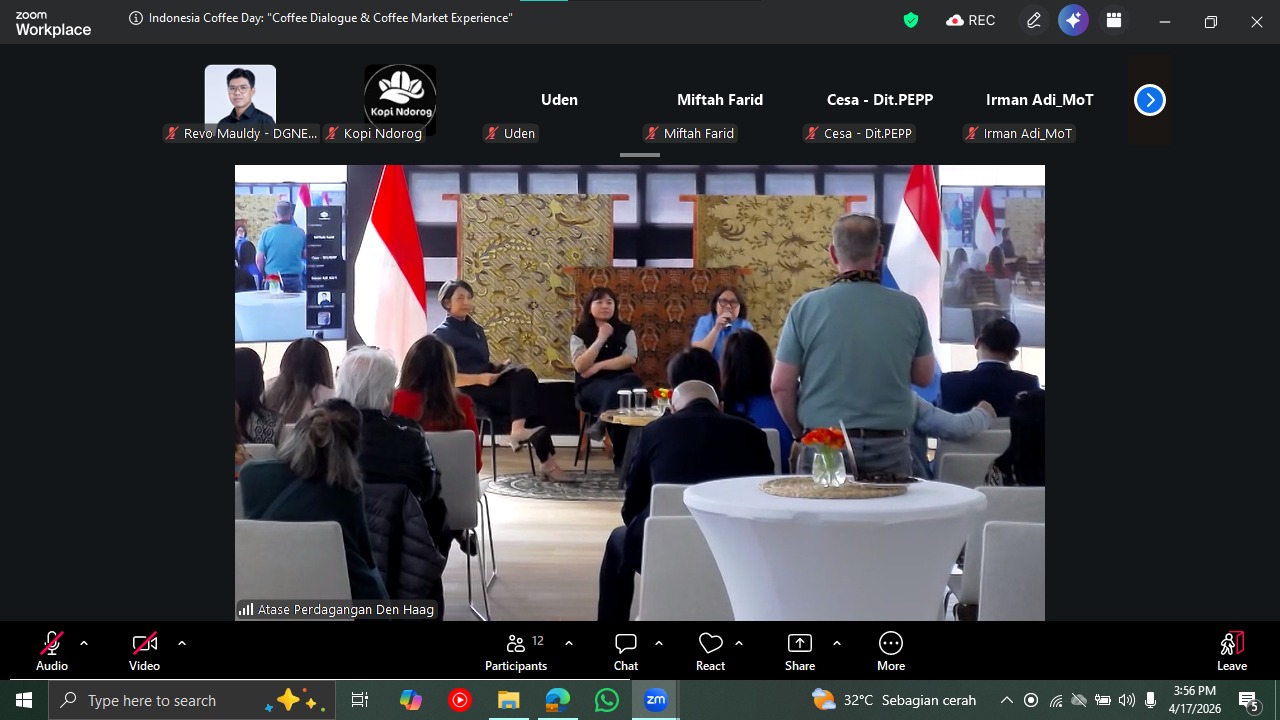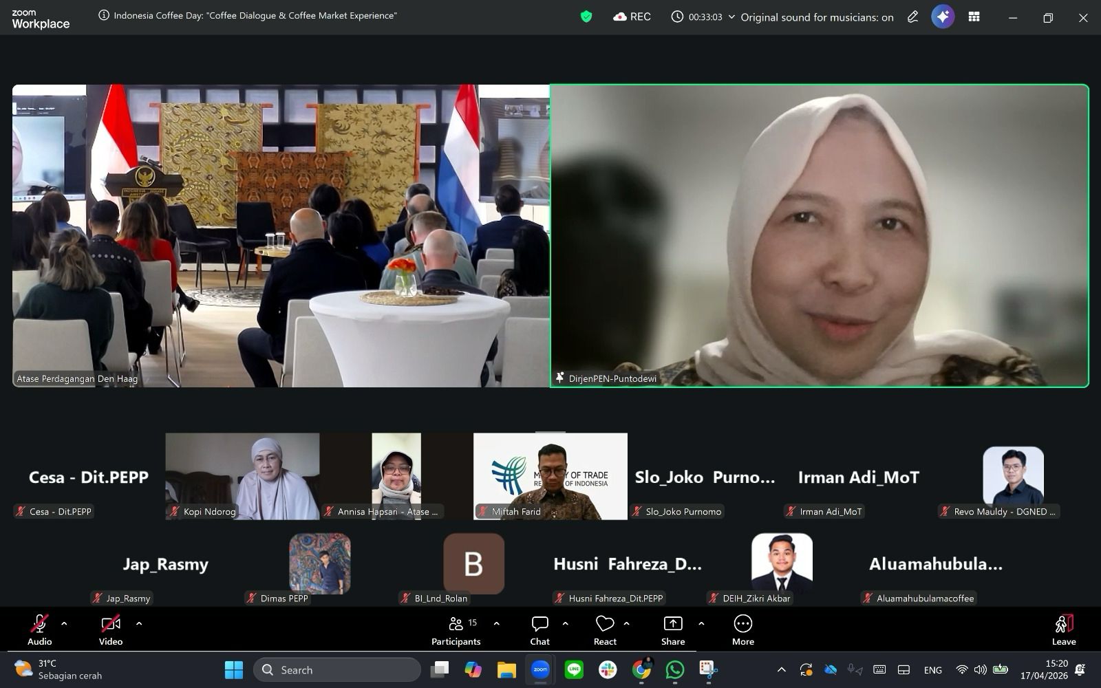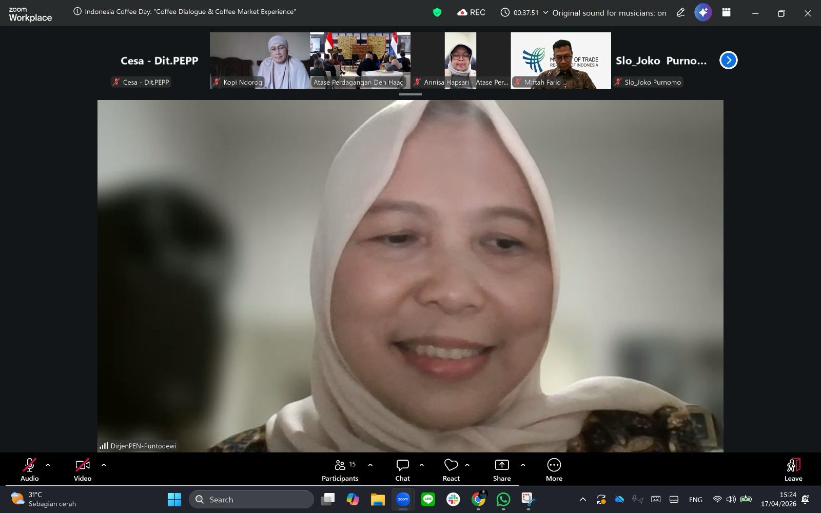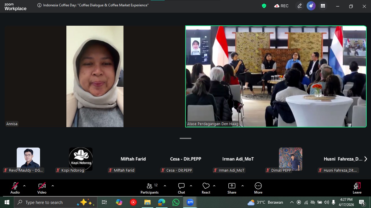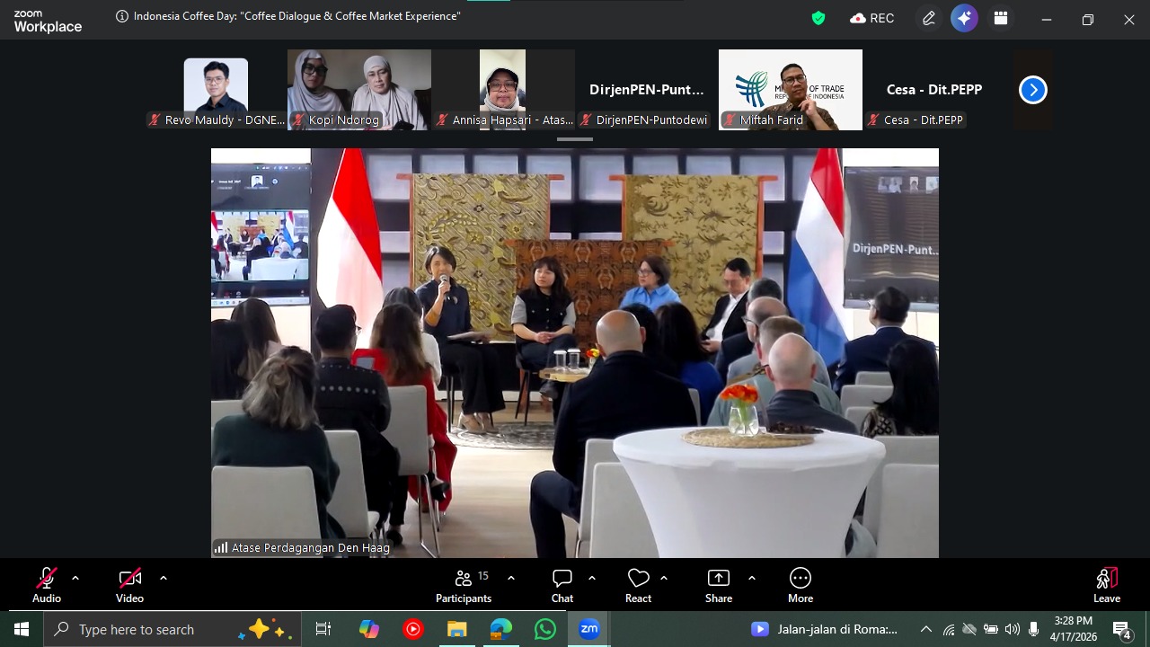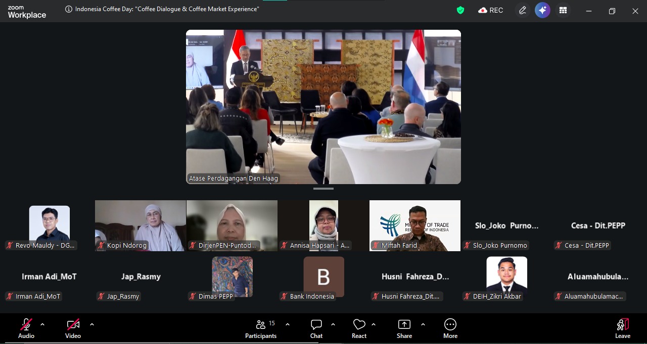 Dirjen Pengembangan Ekspor Nasional, Fajarini Puntodewi memberikan keynote speech secara daring pada acara Indonesia Coffee Day bertema “Coffee Dialogue and Coffee Market Experience” yang diselenggarakan di Amsterdam, Belanda, pada Jumat (17 April). Indonesia Coffee Day bertujuan memperkuat promosi kopi Indonesia, memperluas jejaring bisnis, serta mendorong peningkatan ekspor kopi ke pasar Eropa yang potensial. Acara ini juga menjadi momentum peluncuran Indonesia House of Beans, sebagai fasilitas permanen untuk mendukung promosi dan distribusi kopi Indonesia di pasar Eropa, khususnya Belanda. Pemerintah mendorong pemanfaatan Belanda sebagai hub strategis untuk penetrasi pasar Eropa serta meningkatkan daya saing kopi Indonesia melalui inovasi, keberlanjutan, dan penguatan branding di pasar global. Turut hadir, Duta Besar RI untuk Kerajaan Belanda, Deputi Kepala Perwakilan Bank Indonesia London, serta para pelaku usaha kopi Indonesia dan Belanda.