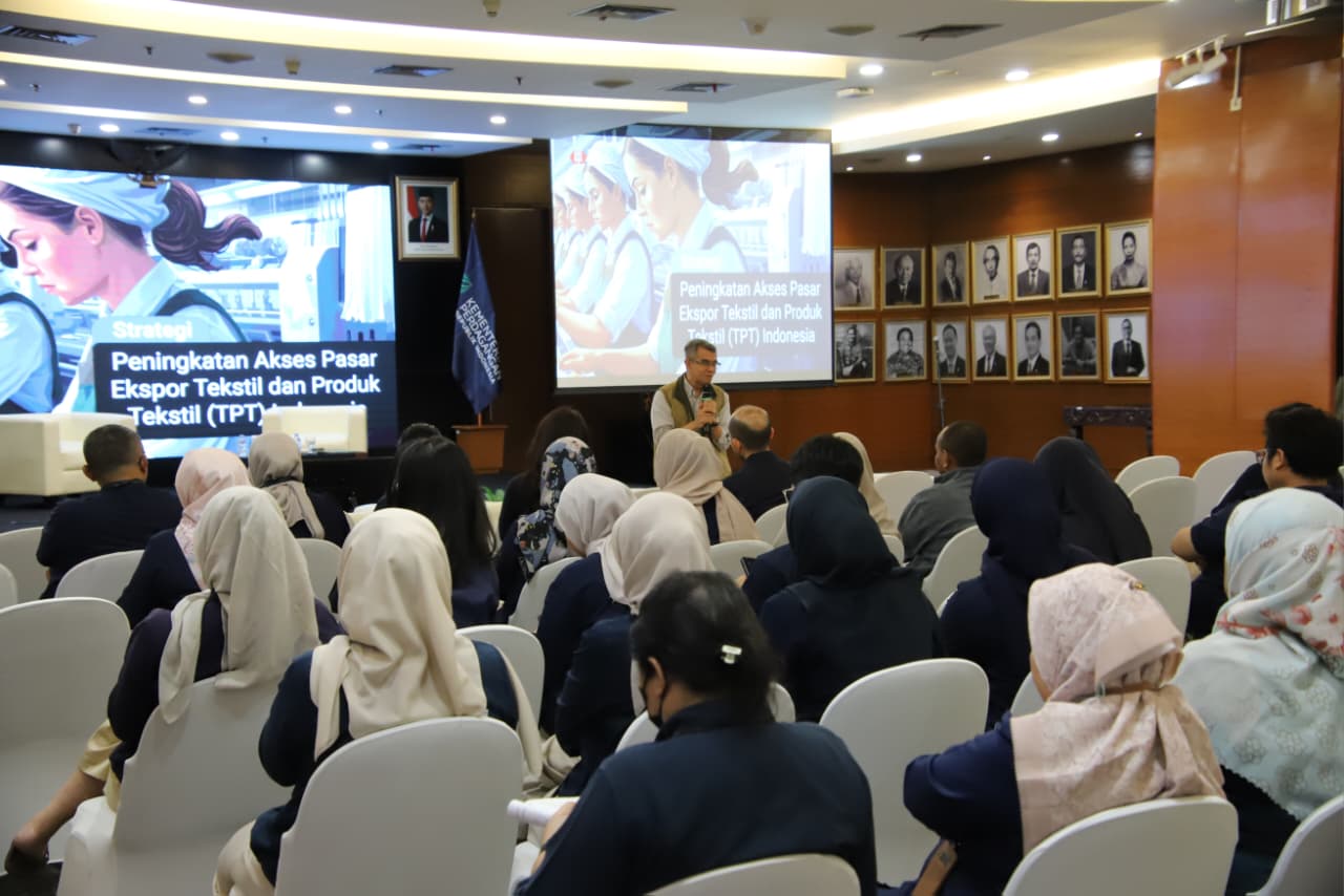 Direktorat Jenderal Pengembangan Ekspor Nasional menggelar kegiatan Knowledge Sharing dengan tema “Daya Saing dan Tantangan Ekspor Industri Tekstil dan Produk Tekstil (TPT) Indonesia dari Hulu ke Hilir di Tengah Disrupsi Global” di ruang auditorium Kemendag Jakarta pada Rabu, (18 Feb). Knowledge sharing diselenggarakan secara berkala untuk memperkuat kapasitas dan pemahaman para pegawai Ditjen Pengembangan Ekspor Nasional untuk mendukung tugas-tugas perumusan kebijakan, analisis pasar, serta fasilitasi pelaku usaha dalam rangka peningkatan daya saing dan pengembangan ekspor. Narasumber pertama adalah Vice Director III (Cooperation & Student Affair) Politeknik Sekolah Tinggi Tehnik (STT) Bandung, Asri Senoaji Soekoco yang memaparkan struktur industri hulu TPT, tantangan produktivitas, bahan baku, dan juga isu keberlanjutan. Adapun narasumber kedua, Direktur Eksekutif Asosiasi Pertekstilan Indonesia, Danang Girindrawardana menyampaikan paparan tentang kondisi industri TPT, tren ekspor, daya saing, serta hambatan pasar terkini. Kegiatan dihadiri pula oleh Direktur Pengembangan Ekspor Produk Primer, Miftah Farid; Direktur Pengembangan Ekspor Produk Manufaktur, Deden Muhammad Fajar Shiddiq; dan Direktur Pengembangan Ekspor Jasa Produk Kreatif, Ari Satria.