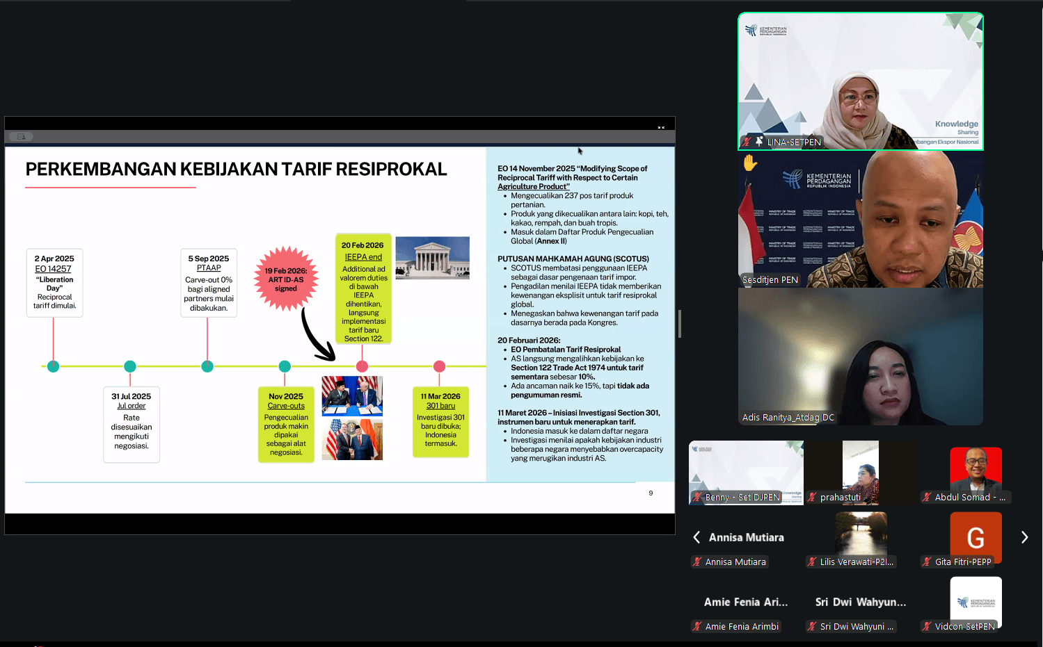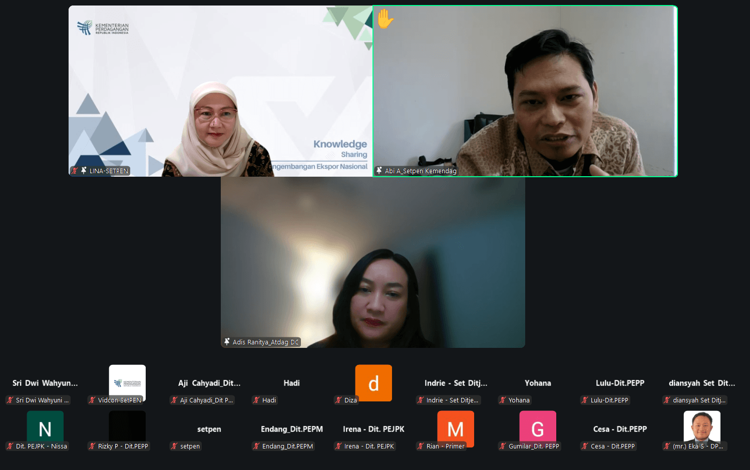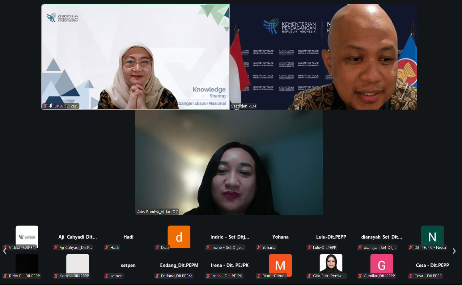 Direktorat Jenderal Pengembangan Ekspor Nasional menggelar kegiatan Knowledge Sharing dengan tema “Konfigurasi Kebijakan Perdagangan AS dan Strategi Promosi Produk Ekspor” secara daring pada Jumat, (13 Maret). Knowledge sharing diselenggarakan secara berkala untuk memperkuat kapasitas dan pemahaman para pegawai Ditjen Pengembangan Ekspor Nasional untuk mendukung tugas-tugas perumusan kebijakan, analisis pasar, serta fasilitasi pelaku usaha dalam rangka peningkatan daya saing dan pengembangan ekspor, terutama dalam menghadapi perkembangan perdagangan global terkini. Sebagai narasumber adalah Atase perdagangan Washington DC, Ranitya Kusumadewi dan dipandu oleh Kepala Bagian Umum Sekretariat Ditjen PEN, Lina Ranty. Atdag Washington DC menyampaikan bahwa pasar AS sangat signifikan artinya bagi Indonesia. Sukses ekspor Indonesia ke AS ke depan akan ditentukan banyak aspek, untuk itu pemerintah Indonesia dan pelaku usaha harus jeli membaca perubahan arah kebijakan perdagangan AS dan mempersiapkan diri untuk terus beradaptasi dan terus menjaga kepecayaan pembeli AS. Kegiatan Knowledge Sharing dihadiri oleh Sekretaris Direktorat Jenderal Pengembangan Ekspor Nasional Arief Wibisono dan seluruh pegawai di lingkungan Ditjen Pengembangan Ekspor Nasional.