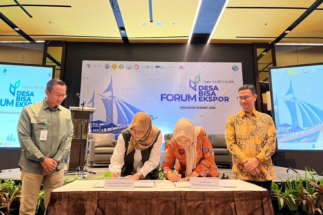 Serangkaian dengan kegiatan Forum Desa Bisa Ekspor, Dirjen Pengembangan Ekspor Nasional, Fajarini Puntodewi bersama Dirjen Perhutanan Sosial Kementerian Kehutanan, Catur Endah menandatangani perjanjian kerjasama tentang Pengembangan Kelompok Usaha Perhutanan Sosial (KUPS) dan Produk Hasil Hutan Perhutanan Sosial Berorientasi Ekspor dalam Pengembangan Ekspor Nasional, di Makassar Sulawesi Selatan pada Selasa, (10 Maret). Turut mendampingi, Direktur Pengembangan Ekspor Produk Primer Miftah Farid. Penandatanganan kerja sama menjadi wujud nyata memberdayakan KUPS melalui pertukaran data, peningkatan kapasitas, hingga promosi produk hasil hutan yang dikelola masyarakat secara berkelanjutan selama jangka waktu lima tahun. Melalui perjanjian ini, diharapkan lebih banyak lagi produk produk Perhutanan Sosial berorientasi ekspor yang mendapatkan pendampingan teknis peningkatan daya saing serta memperoleh perluasan akses pasar, terutama pasar ekspor. Usai penandatanganan, Dirjen Puntodewi juga berkesempatan melakukan kunjungan ke Kelompok Usaha Perhutanan Sosial (KUPS) di Maros, Sulawesi Selatan. Program KUPS Kememhut merupakan inisiatif pemberdayaan ekonomi masyarakat sekitar hutan melalui pengelolaan hasil hutan secara berkelanjutan.